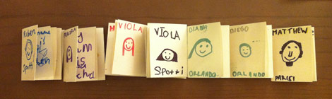 Today we made little stories about ourselves with Instant Books, the easiest and quickest books to make in the world! Everybody made their own book from 1 A4 sheet of shiny paper. After 3 good folds and 1 small cut, the piece of paper magically transforms into an mini book consisting of front/back covers and six inside pages. After making the form of the book, we illustrated them using coloured marker pens with a HELLO, small self portrait, name, age, ‘likes’ and GOODBYE.
