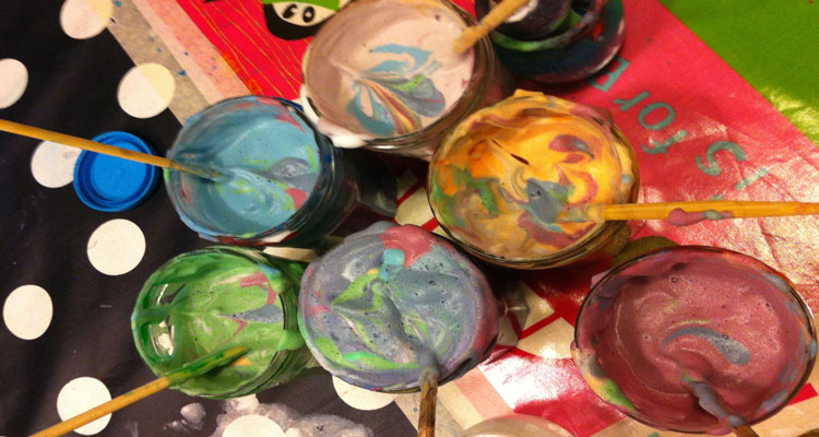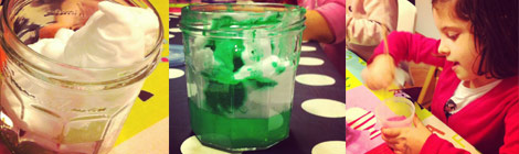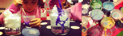 This week we attempted a scientific experiment with our rainbow colours, water and shaving cream! Each clear jar was filled with a little water (for effect) and a big squirt of shaving cream to create great big puffy CLOUDS. In another jar we prepared our coloured rain, by mixing water and paint.