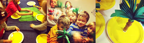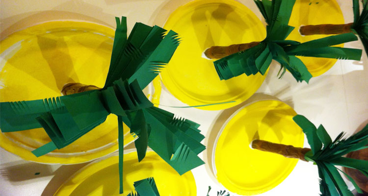Making a desert island disc is fun and easy. Take a paper plate, paint it yellow (to represent the sand), then roll at least 3 sheets of green paper at different starting points. i.e. don’t start rolling them all at the same time. Roll one sheet into the next and so on. Once you have rolled them all together, secure them with an elastic band and cut at least 3 slits to the half way point. You can then pull the leaves of paper out and bend them back to make giant palm leaves. Cut into the leaves to create a palm leave effect.