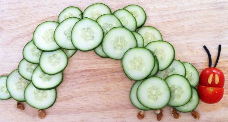 Do you recognise our very hungry friend? Yes, one of our experiments with food turned into The Very Hungry Caterpillar by Eric Carle. We love reading this story, so we decided to create our very own hungry caterpillar with cucumber slices, walnuts, a cherry tomato, melon seeds, and liquorice.