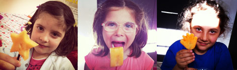To make our fruit just that bit more fun, we cut some jolly nice shapes with biscuit cutters and made some natural fruity lollipops. Here’s Viola with a star, Arianna with a traditional rectangle and Giulia with a sweet hand! The lollipop sticks were made with drinking straws.
