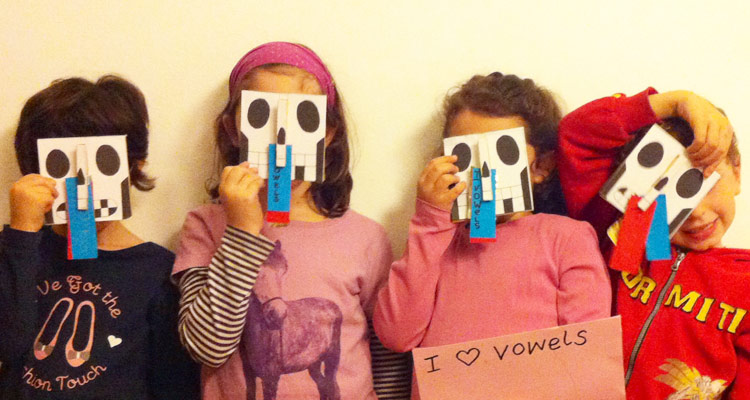 A special halloween treat, a lovely bunch of the 5 vowel letters: A E I O U. We’ve been working hard to remember and pronounce our vowels, so we ate them up…yes, these skeleton clips love them!
