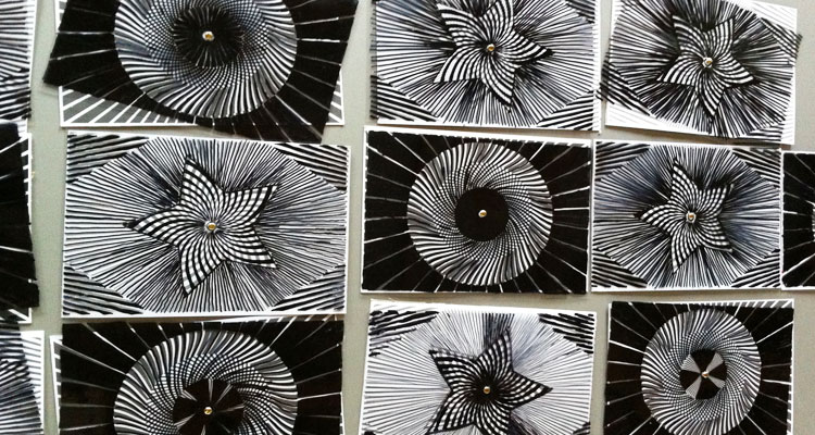 This was followed by setting to work on our own optical animated art. Equipped with optical photocopies, permanent markers, acetate sheets and butterfly pins, we made two types of animation, one based on circular motion and the other in the form of a star.