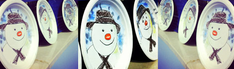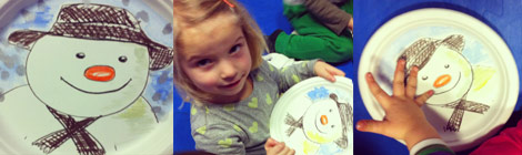 In our workshop we watched the original film, looked at the picture book, and made fingerprint snow using silver ink, on handmade snowman paper plates. The snowman smiles with his woolly scarf and hat, tangerine nose and coal eyes. We had a wonderful time playing with this beautiful childhood fantasy.