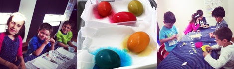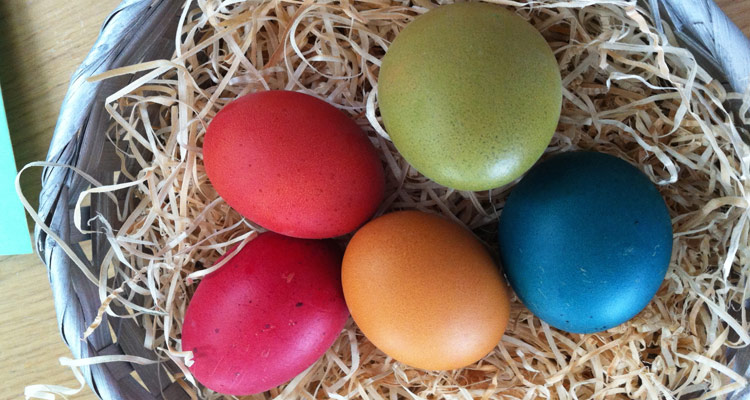 Elisa, Ruben, Luca, Lorenzo and Anna prepared the dishes of coloured dye, before gently placing the eggs inside for five minutes. Even though we used spoons to lift the eggs out of the dye, we still managed to turn our hands red, blue, yellow, green and pink! Next time we need gloves.