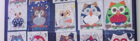 Wise owls made from found materials. These owls were made by 2nd year middle school students using mixed materials.